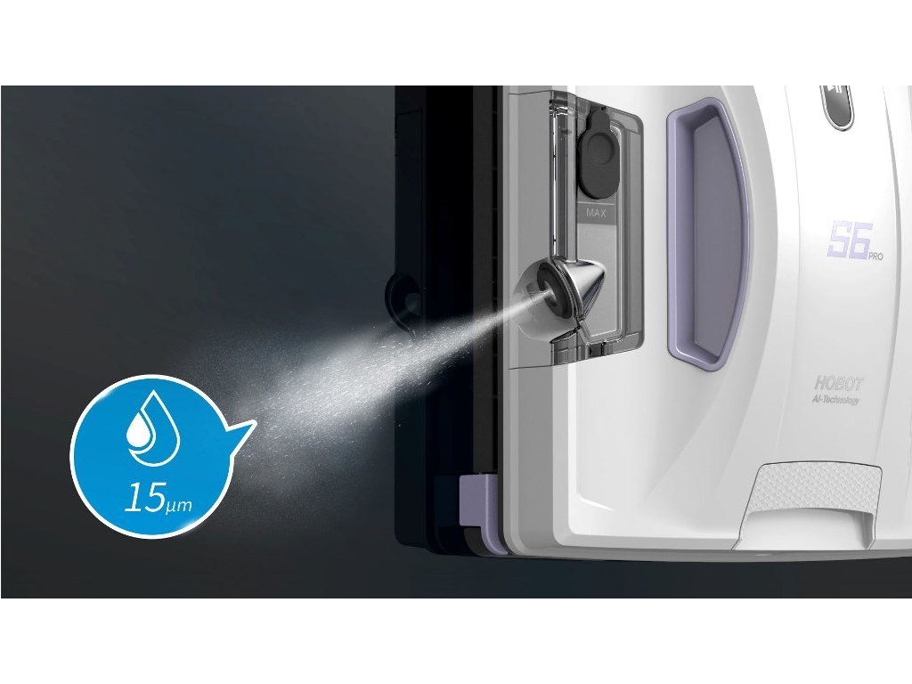 Robotický čistič oken HOBOT S6 PRO je vybaven dvěma zásobníky s ultrasonickými tryskami pro automatické rozprašování vody. Ultrasonické trysky vytváří jemné částečky mlhy o hustotě 15 µm, což zajistí čištění bez zanechání vodních skvrn a jemná vlákna utěrek z mikrovlákna precizně pohlcují nečistoty a odstraňují prach z čištěného povrchu. Ultrasonická tryska velmi dobře funguje s mycím prostředkem HOBOT nebo s čistou destilovanou vodou.