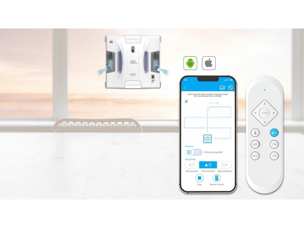 Robotický čistič oken HOBOT S6 PRO může být ovládán pomocí chytrého telefonu přes Bluetooth. Aplikaci pro ovládání si jednoduše stáhnete zdarma na App store nebo Google Play. Aplikace je dostupná v mnoha jazycích včetně češtiny. Pokud nemáte chytrý telefon, nebo vám ovládání přes aplikaci nevyhovuje, můžete HOBOT ovládat pomocí dálkového ovladače.