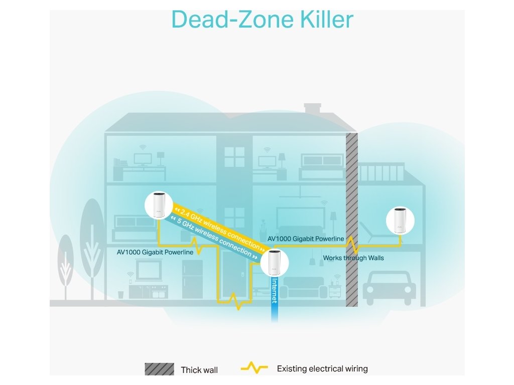 Hybridný systém pre celý dom poskytuje rozšírené pokrytie až do plochy 4 000 štvorcových stôp/370 m2 s pomocou kombinácie dvoch pásiem Wi-Fi a elektrického vedenia. Eliminujte oblasti so slabým signálom v celej domácnosti pomocou Wi-Fi a už nemusíte hľadať stabilné pripojenie.